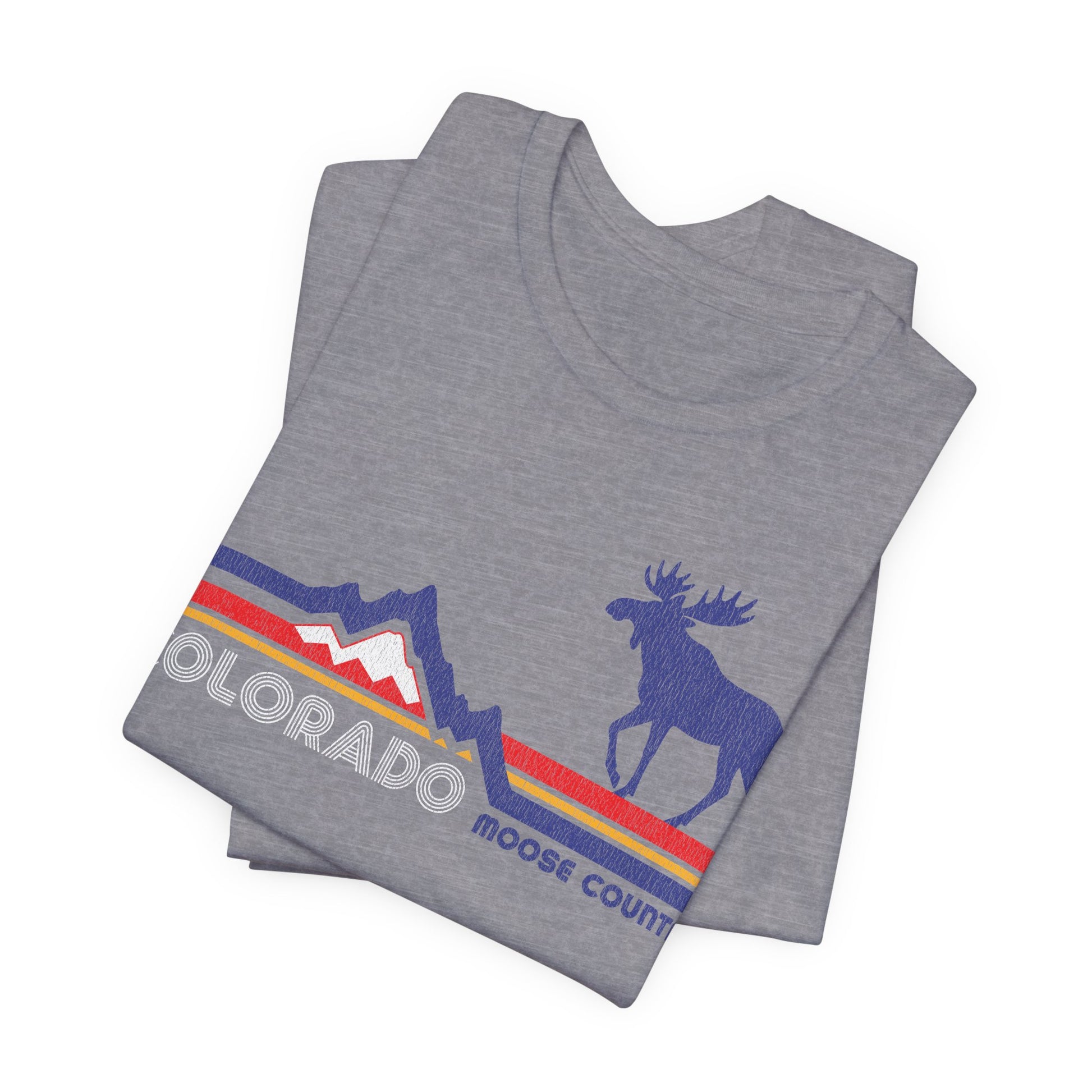 Where alpine peaks meet untamed wilderness, the Colorado Moose Country Retro Stripe Tee captures the quiet power of the high country. A bold moose silhouette strides confidently across layered vintage stripes in deep blue, red, and golden yellow—colors inspired by classic mountain sunsets and timeless outdoor heritage graphics. Snow-capped peaks rise beneath the horizon line, grounding the design in the rugged beauty of the Rockies, while clean retro typography gives it that perfectly worn-in, national park souvenir feel. Printed on a soft heather grey backdrop, this tee feels like something you’d pick up after a long day exploring backroads near Estes Park—an effortless tribute to wide-open spaces, crisp mountain air, and the wild spirit that defines Colorado’s moose country.