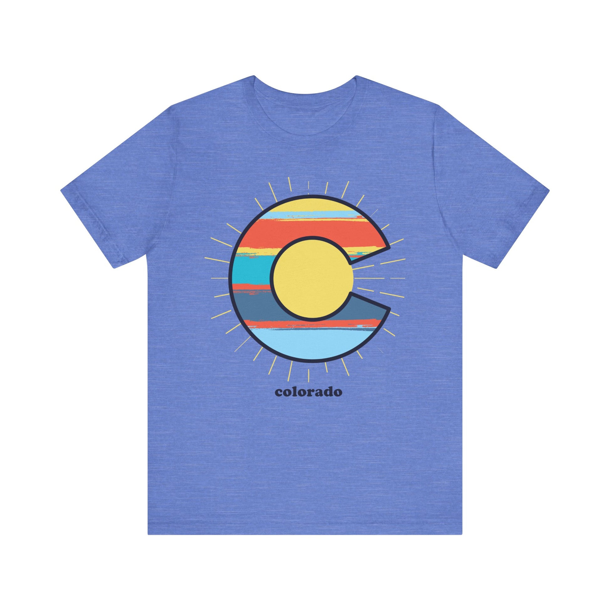 Bold, bright, and unmistakably Colorado, the Radiant “C” Retro Stripe Tee reimagines the iconic state emblem with a sun-soaked, vintage twist. A large graphic “C” anchors the design, filled with layered sunset-inspired stripes in warm red, golden yellow, and cool mountain blue—each brushstroke echoing painted skies over the Front Range. Subtle sun rays radiate outward, giving the emblem a sense of energy and movement, like first light breaking over the peaks. Finished with clean, understated “colorado” typography beneath, this design blends classic state pride with a modern, throwback aesthetic—perfect for long summer days, high-country adventures, and everything in between.