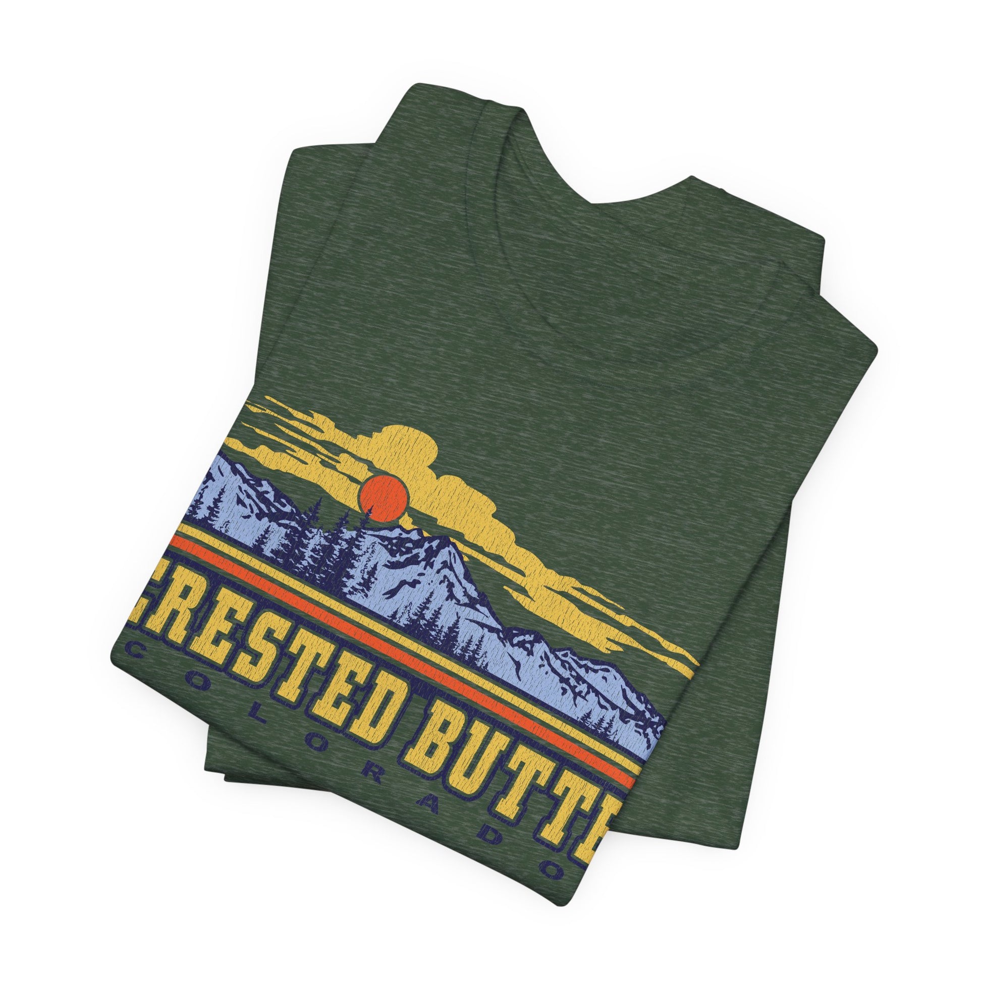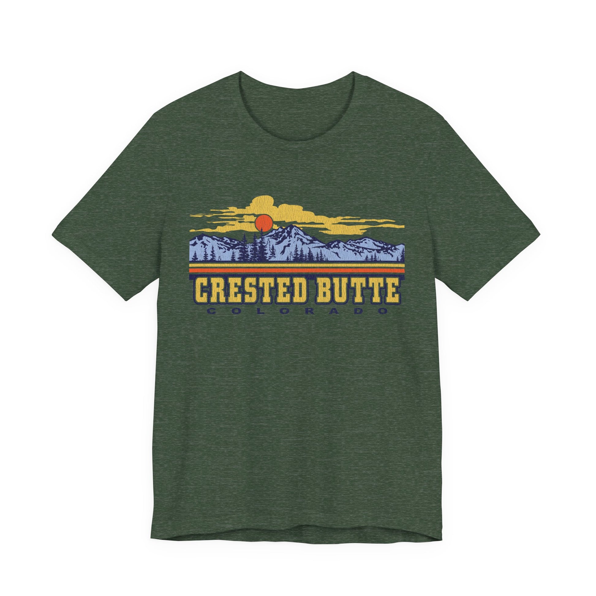 Capture the wild spirit of Colorado’s high country with this beautifully illustrated Crested Butte tee, designed for those who can’t resist the pull of alpine horizons. A bold, vintage-inspired landscape stretches across the chest, featuring snowy blue ridgelines, towering evergreens, and a fiery orange sun rising through golden clouds. Framed with retro striping and anchored by classic block lettering, this design feels like a postcard from your favorite mountain morning. Perfect for hikers, powder chasers, and anyone who believes the best views come after a climb, this shirt brings the magic of Crested Butte wherever your travels lead.