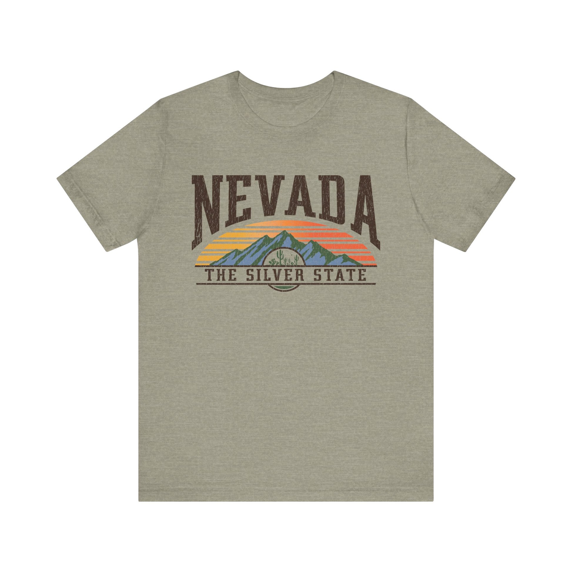 Celebrate the rugged beauty and untamed spirit of the American West with our Nevada “The Silver State” Vintage Desert Horizon Tee. This design features a classic, weathered-style illustration of Nevada’s iconic mountain ranges rising beneath a warm desert sunset, complete with subtle cactus accents that nod to the state’s wild landscape. Earthy tones, retro striping, and bold typography come together to create a timeless, road-trip-ready look that feels both nostalgic and adventurous. Whether you’ve wandered Nevada’s open roads or simply admire its desert mystique, this tee captures the soul of the Silver State in a perfectly worn-in, effortlessly stylish design.