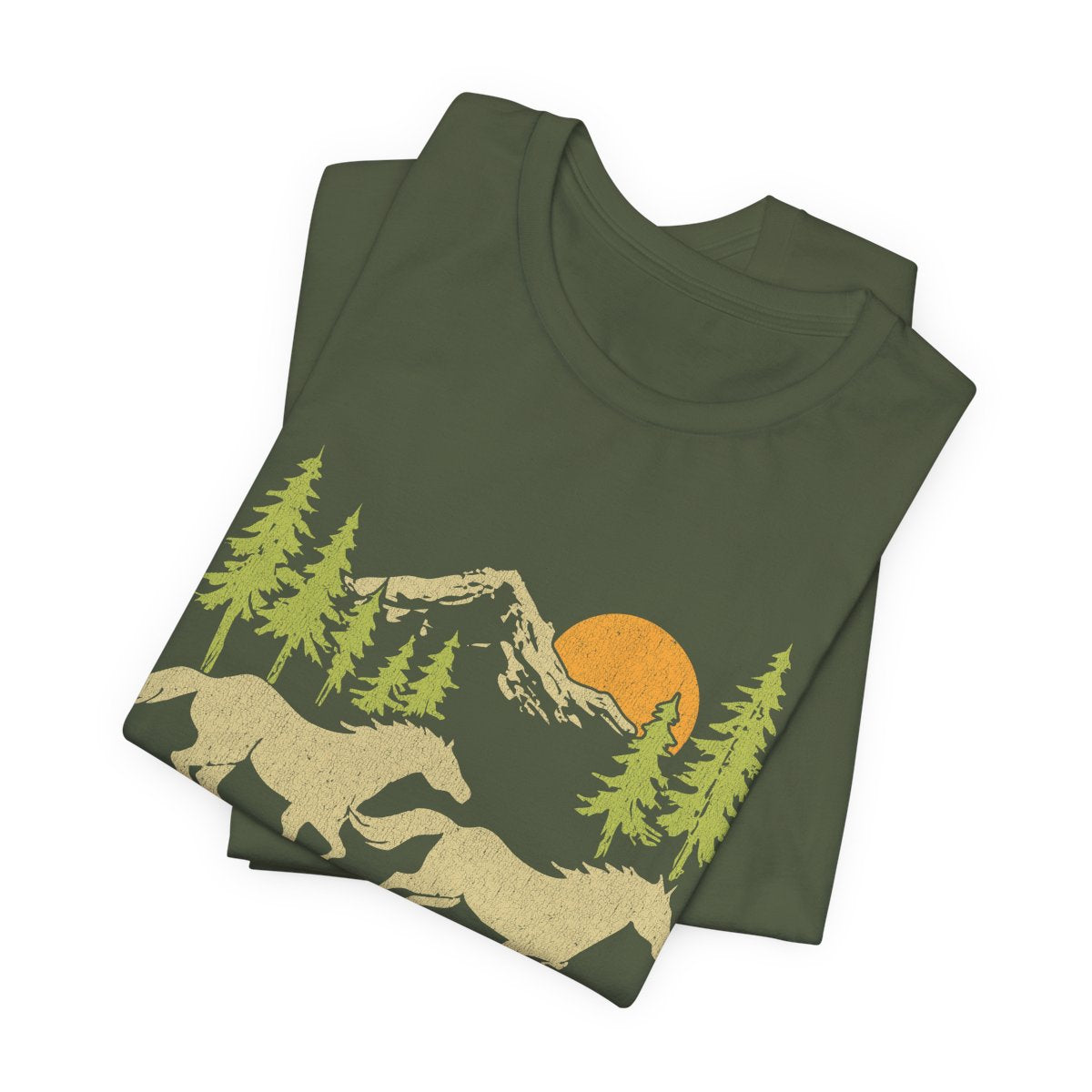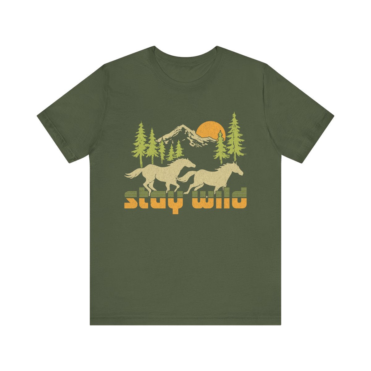 Embrace your free spirit with our “Stay Wild” retro mountain tee — a design that celebrates the untamed beauty of the great outdoors. Featuring two wild horses in motion, towering evergreens, rugged peaks, and a warm sunset glow, this shirt captures the feeling of open landscapes and limitless adventure.